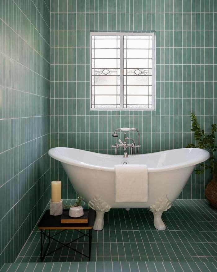Green-blue micro squares are the nap you didn’t know you needed. Mix satin and gloss tiles of the same tone to fake age and depth. Pair with cream paint and a single plant. This small-scale blue floor tiling gives you good traction too.
