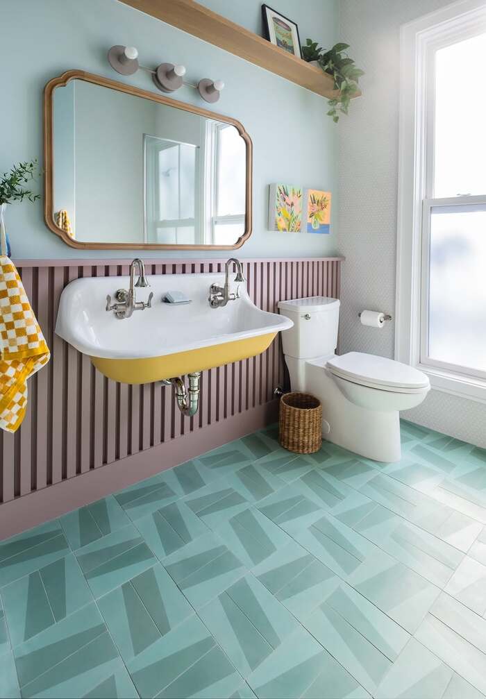 The mint pattern is perfect for kids or guests because it’s fun but not loud. Center your layout on the vanity or window so the pattern feels intentional. This patterned blue flooring tile cleans up easy. Toothpaste won’t win. Promise.