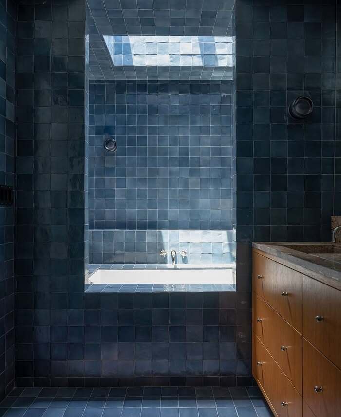 Handmade squares bounce light and give soul. Seal twice before use because zellige is thirsty. A deep indigo blue tile floors field with warm wood vanity is moody in a good way. If your LEDs run cool, swap to 3000K so the color stays rich.