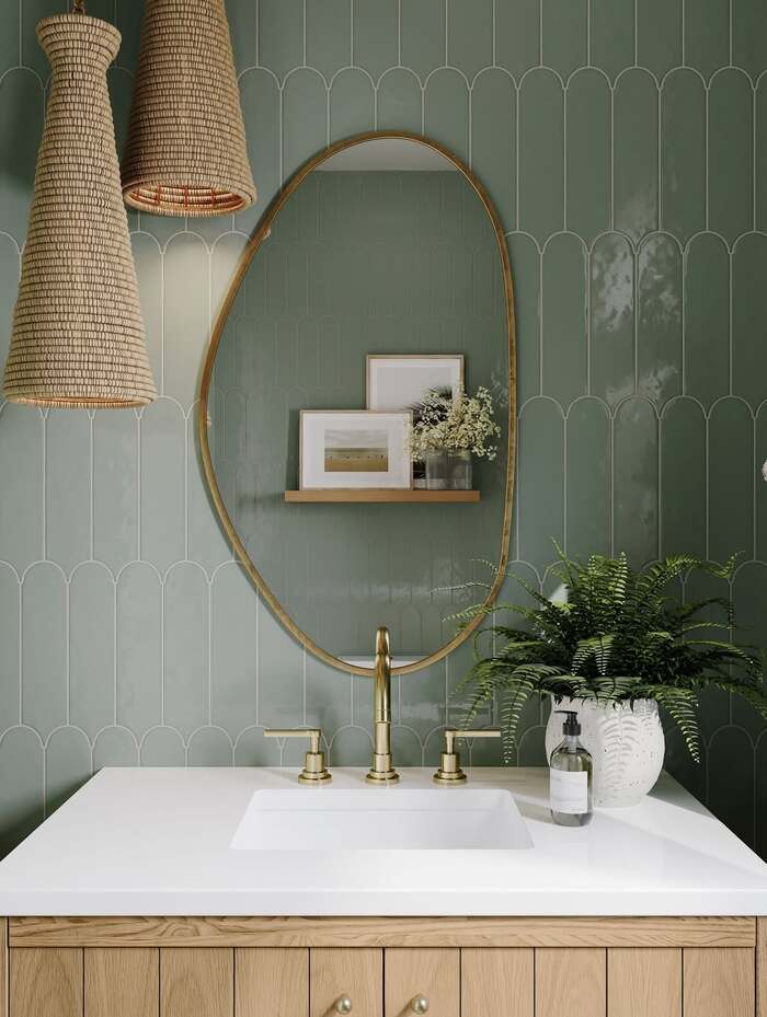 Here’s a gentle combo for renters turned renovators. Minty field tile next to white scallops and a skinny brass frame. If your heart says aqua subway tile bathroom but the budget says keep it calm, mint is your friend. It still harmonizes with the rest of our 10+ blue subway tile bathroom roundup because it lives in the same cool family.