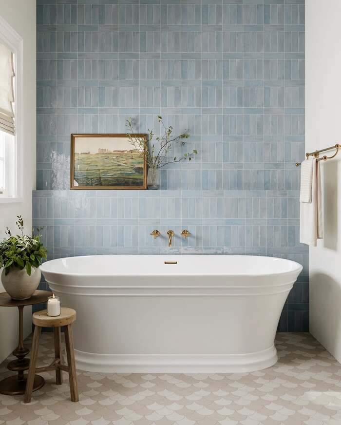 Elongated scallops give the same rhythm as subway, just softer. I’m into this when clients crave movement but still want a classic. Mix a light blue subway tile bathroom on the tub surround with white walls so the texture pops. If you’re collecting ideas for a 10+ blue subway tile bathroom, save a scallop option too. It plays nice with rattan, linen, and cozy towels.