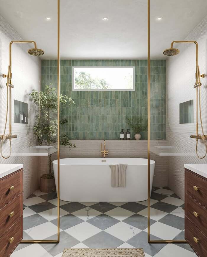 Designers love a neutral floor, but I like a cheeky checkerboard. It lets a teal subway tile bathroom wall feel grounded. Keep the checks large so the room doesn’t look busy. If you want to keep the 10+ blue subway tile bathroom thread, shift the wall color a hair toward marine blue and repeat it on the bath mat.