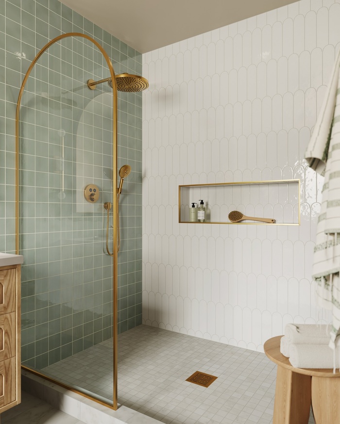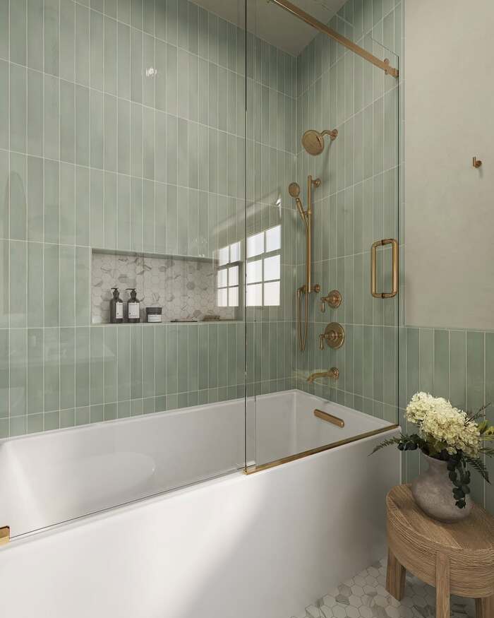 Families need storage and easy cleaning. Here the long niche, warm brass fixtures, and glossy glaze check all the boxes. If you want a powder blue subway tile bathroom version, swap the mint for a pale sky blue and keep the marble niche. It will still link back to our 10+ blue subway tile bathroom pool of ideas.