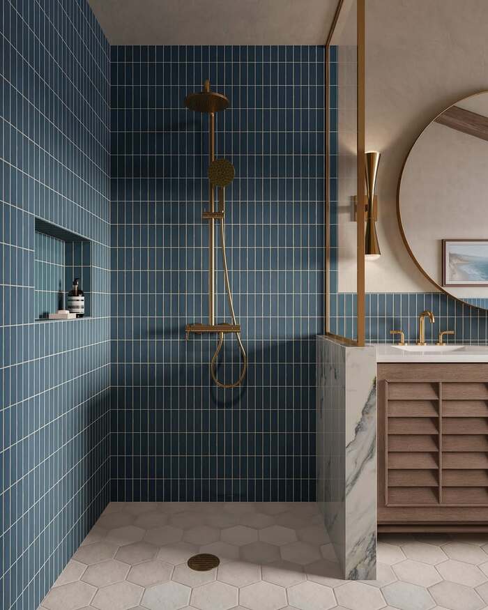Size games. Narrow tiles feel elegant. Wide ones look more casual. If you love a bold navy subway tile bathroom, test one box on your wall first. Blues shift a lot in different lighting.