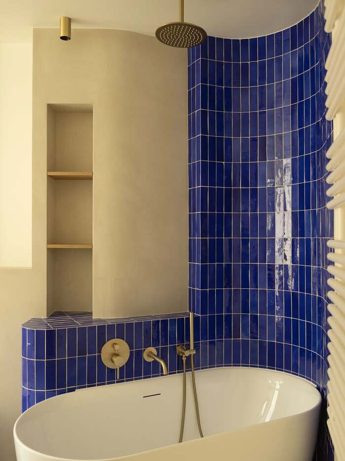 Brass is perfect with blue, especially deeper shades. It warms the palette and feels cozy, which is why so many blue shower tile ideas lean that way.
