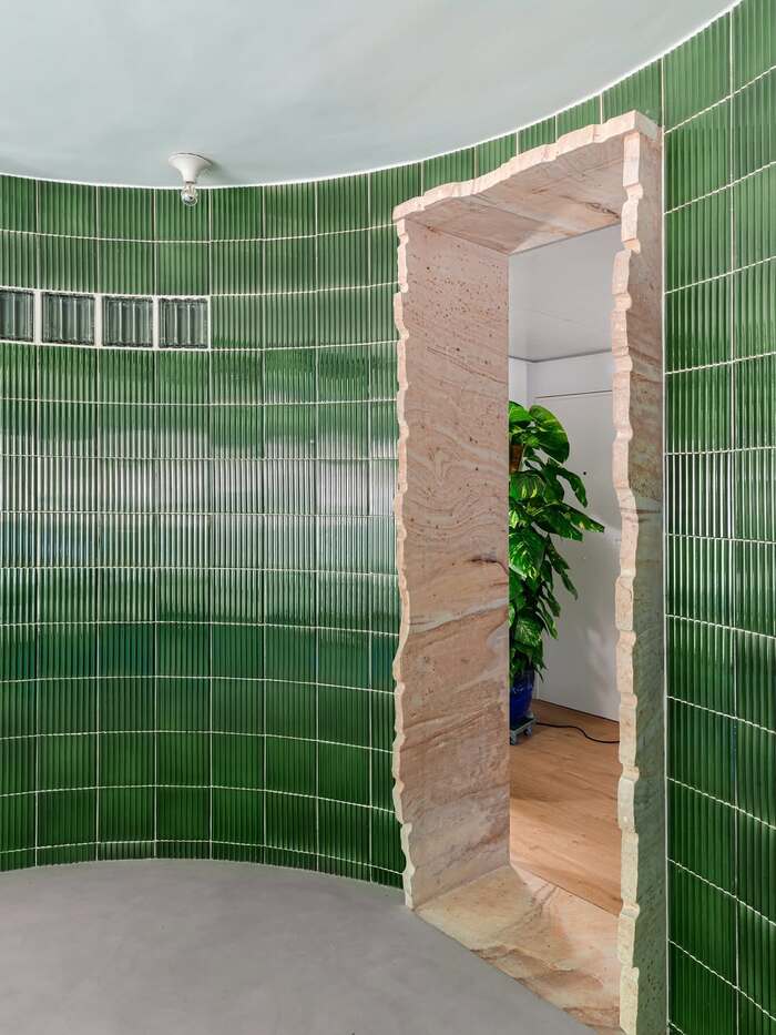 Yes this leans green, but teal lives on the blue team, promise. Another pick from my 10+ blue tile shower ideas because it shows texture doing the heavy lifting. These ribbed, glossy tiles run vertically inside a curved wall, then a raw stone doorway slices through like a cave opening. That messy edge is everything. In a world of perfect rectangles, the chiseled jamb makes the color feel natural, almost like a lagoon. If you want blue tile shower ideas with drama, steal the texture. You can get fluted ceramic in navy or deep ocean blue, then pair with limestone or travertine slabs. Keep hardware simple in black or bronze so the ribs stay the star. Grout tip, match the tile tone, not white, otherwise every ridge traps a tiny white stripe and it looks busy. Lighting matters here too. One small ceiling spot is enough. Let shadows graze those ribs for free depth.