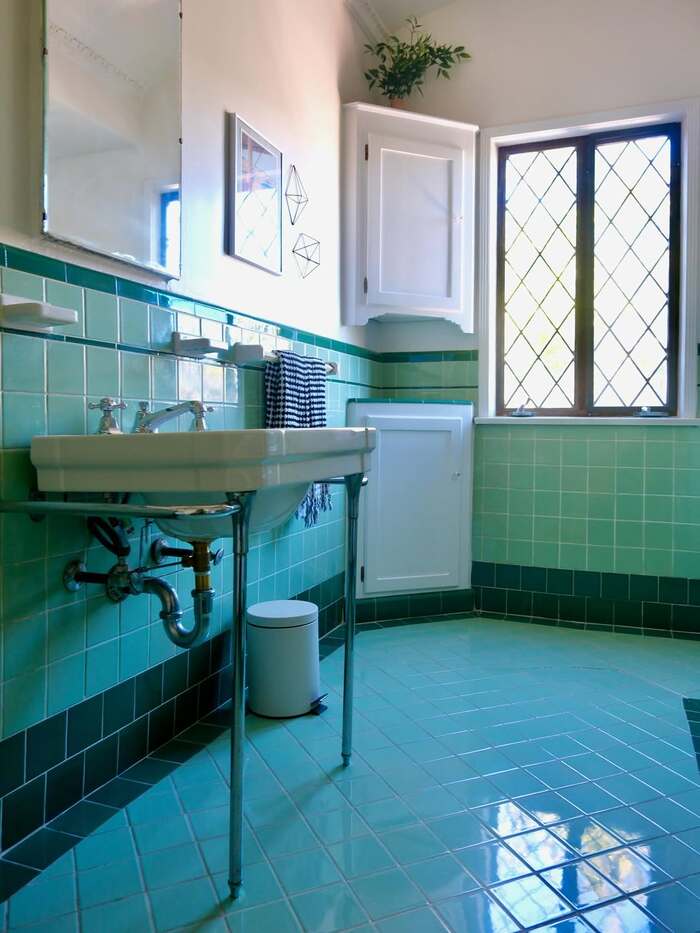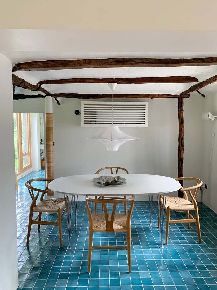 This dining space has a turquoise floor that accidentally taught me a bathroom trick. In small homes, your bathroom might touch a hallway or laundry. Carry the same aqua or sky-blue tile from the shower floor out into a short walkway and you get that resort feeling. I added it to my 10+ blue tile shower ideas because it shows how color zones a home. For blue bathroom tile shower ideas, choose a handmade square tile around 4 inches, install with a wider grout joint, and don’t overthink perfect alignment, rustic is charm. If slip worries you, choose a matte finish or a subtle texture. To avoid the space screaming beach theme, counter the blue with natural wood stools, woven chairs, or a rattan hamper. Also, consider a low white baseboard so the tile doesn’t crawl up the wall everywhere. My confession, I once tiled too high and it felt like a pool locker room. Learn from me, stop at the floor.