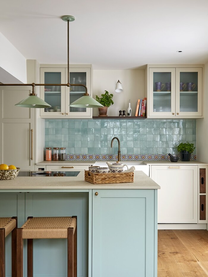 This kitchen backsplash sparked one of my favorite blue shower tile ideas and made the 10+ blue tile shower ideas list for a reason. Soft sky zellige tiles have that wobbly, handmade look that turns light into sparkle. In a shower, I’d run them in a brick pattern and add a single band of patterned tiles at eye level, like a mini mosaic racing stripe. It’s Mediterranean without shouting. One trick I learned stalking tile accounts, choose a border tile that includes your wall and fixture colors, so the band ties the room without bossing it. If you’re afraid a pattern gets old, keep it to one or two rows, maybe just along the long wall. Maintenance tip, zellige has pinholes. Use a good penetrating sealer and a grout release when installing so cleanup isn’t a cry session. For blue shower tile ideas variations, try powder blue with brushed nickel or dusty aqua with cream grout.