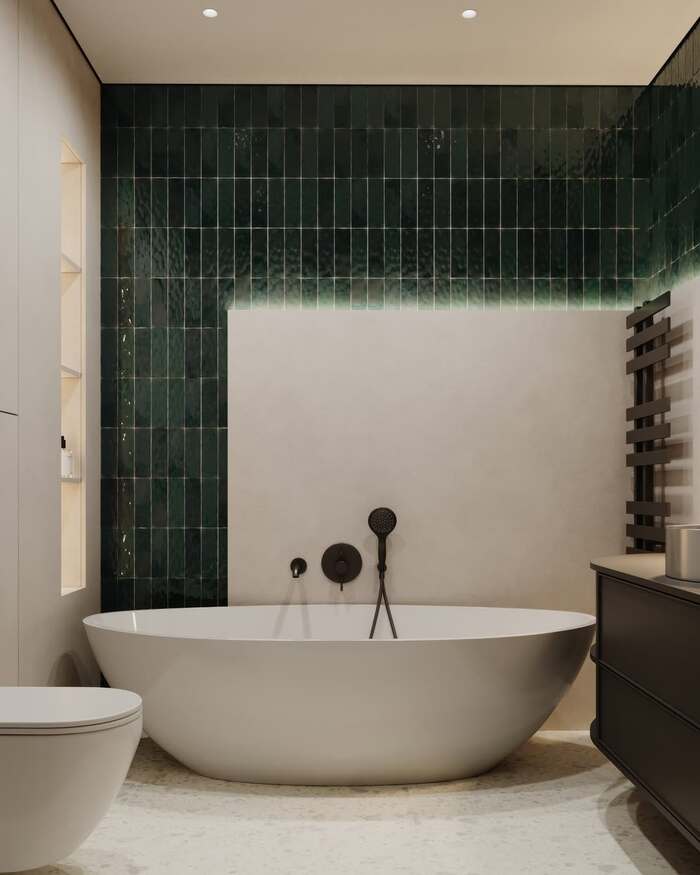 Moody bathrooms photograph like movie scenes and this one gives that energy. Dark teal, nearly blue-black, set vertically behind a floating oval tub. I put it smack in the middle of my 10+ blue tile shower ideas because it is proof that deep tones can still feel calm. If your space is windowless, add a warm LED strip where tile meets plaster. The light washes the wall so it doesn’t read like a solid block. For blue tile shower ideas, choose a semi-gloss so water spots wipe off easier than matte. Use a niche within the tile wall, not a metal shelf, and line the niche with the same tile rotated horizontally so the pattern breaks a little. Black fixtures work when the grout is medium gray. If grout is white, black becomes too graphic. Budget hack, you can tile only the wet zone and skim-coat the rest in limewash for buttery texture that pairs with the blue.