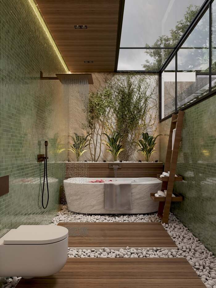 This one screams vacation. A full wet room where rain shower, soaking tub, and a little garden share the same space. It made my 10+ blue tile shower ideas because the palette sits between seaweed green and soft blue, so it feels like you opened a window to a courtyard. For ideas for blue tile showers that are relaxing, consider 1-inch glass mosaics. They reflect light and bend around benches and curved walls. If you can, use a linear drain so floor slopes stay gentle. I love the river-stone bed under the wood stepping boards, but if pebbles scare your feet, choose a small hex mosaic in a sandy beige. Plants thrive if you add a skylight or a grow light bar tucked behind a ledge. Keep maintenance real. Ventilation must be strong and on a timer. Wipe glass weekly and you will keep the spa vibe instead of swamp.