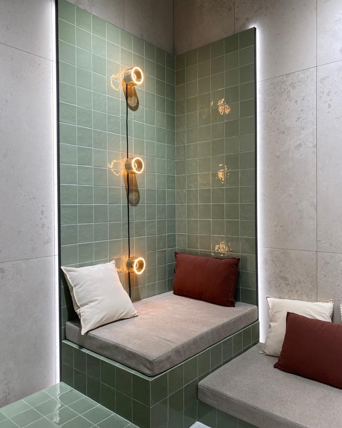 Benches are not only for steam rooms. A small tiled seat can change how you use a shower. I saved this scene to my 10+ blue tile shower ideas because the bench is wrapped in square sage-blue tiles with a soft light strip tucked behind, plus little globe sconces that look like jewelry. For blue bathroom tile shower ideas, build your bench 15 to 18 inches high and at least 12 inches deep so it’s actually usable. Slight slope toward the drain so water doesn’t pool. If you sit to shave like I do because my balance is questionable before coffee, you’ll thank that bench every week. Use a rounded edge tile or a Schluter trim in brushed brass to finish corners without sharp bites. Cushions are cute for photos but skip them in daily life. Instead, a teak slatted mat on top warms the seat and lifts you off cold tile.
