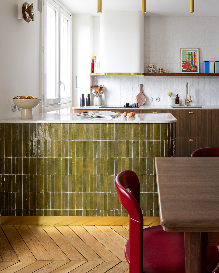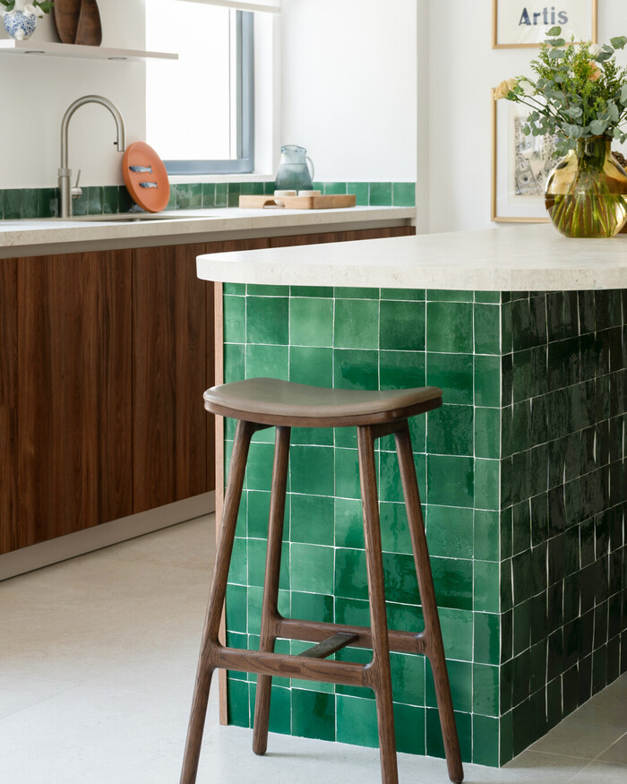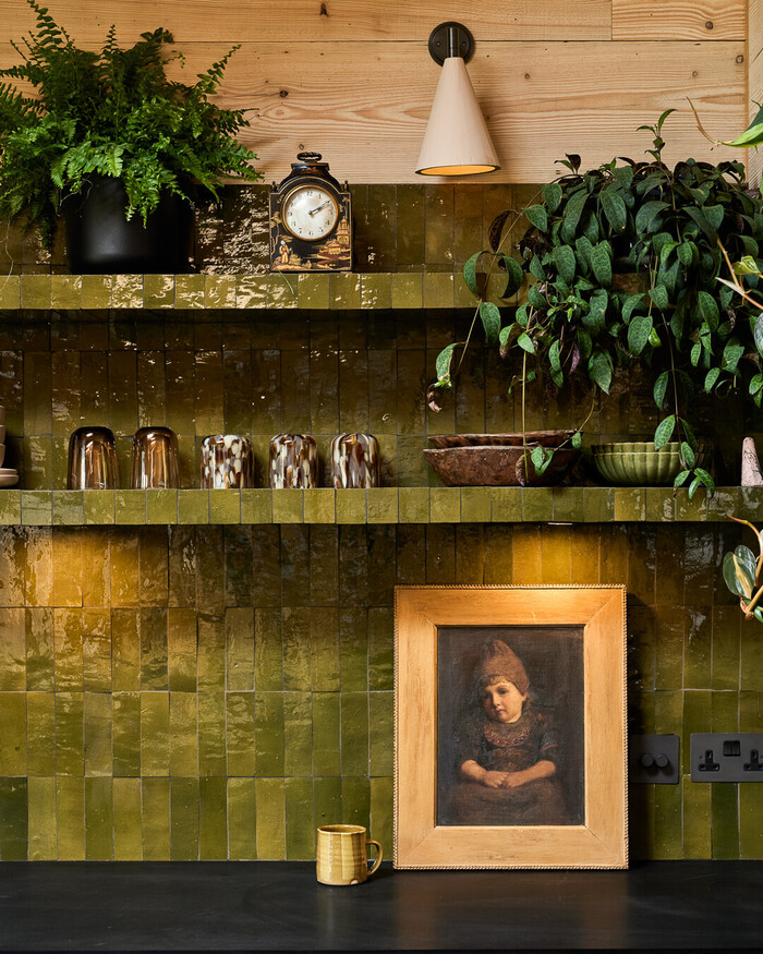 If you copy it at home, bring the tile around the shelf’s top and bottom for a thick slab effect. Hide your under-shelf lights toward the back for soft grazing light that makes the glaze shimmer. A navy blue tiled wall would also work in this layout if you want more classic.