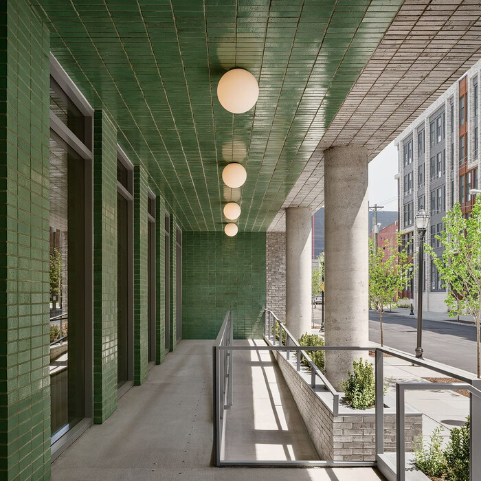 Yes, this last one is outside, but it totally belongs. A building wraps its porch with green-blue brick tiles on the walls and ceiling. The result is graphic and kind of cinematic, and it turns a plain walkway into a destination.