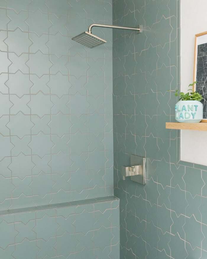 This one is quiet and calming, like morning air. The matte glaze and soft star pattern keep the blue tile wall from feeling busy. I’d color-match the grout so the motif reads like texture, not lines.