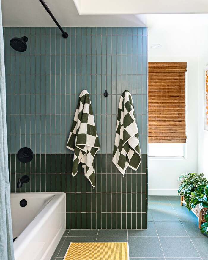 Top half sky blue. Bottom half forest green. Vertical stack tiles pull the eye up, which makes small baths feel taller. The split line acts like a belt, very flattering. Use a 60 over 40 ratio so the lighter blue tile wall stays the hero.