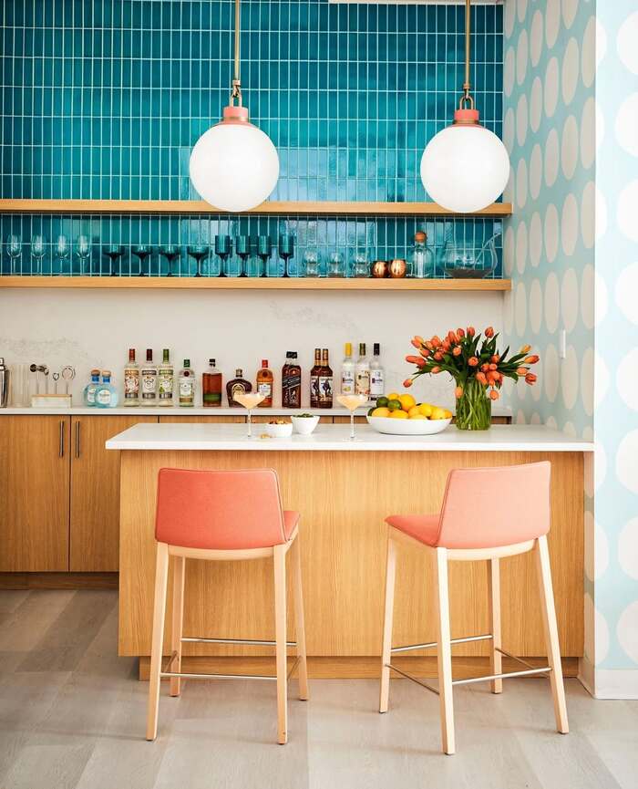 This is the fun cousin. A shiny blue tile wall behind open shelves makes glassware glow like candy. I like medium gray grout and globe pendants for soft light.