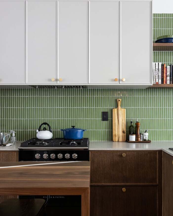 You can swap shelf tile for wood to save cost and still keep the mood. Confession time, I used to think glossy olive was risky, but with black counters and warm lamps, it’s just delicious.