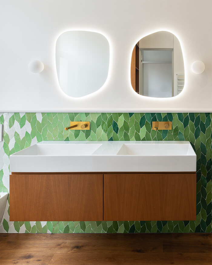 To copy the look, pick a sheet mosaic with three or four tones of blue and green. Keep the rest of the wall bright white so the shape really pops. A trick I love is backlighting the mirrors. It softens any sharp edges that a busy pattern can create.