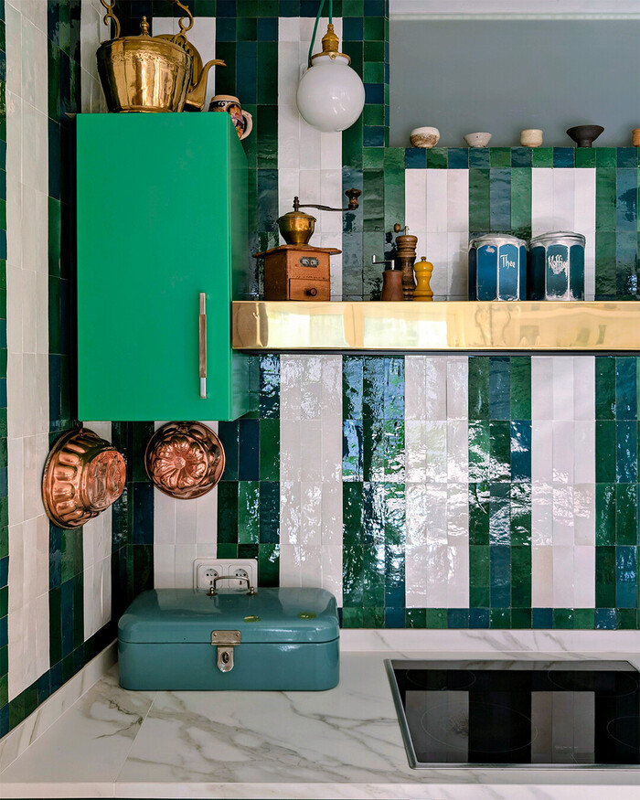 Try a navy blue tile wall variation on the island if emerald is too green, or a teal blue tile wall with off-white grout for a fresh café vibe. I confess, I saved this picture twice by mistake because the sheen makes me weirdly happy.