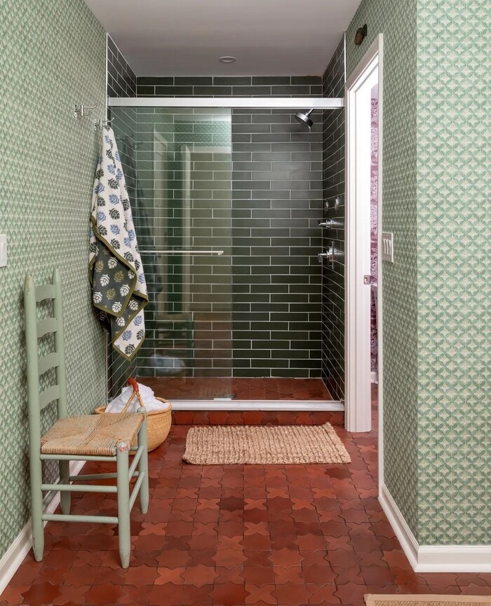 Okay, this one is basically a moody spa. The shower is wrapped in deep bottle green subway tiles, lined up in a classic brick pattern with white grout, and the floor steps down onto red terracotta stars. I saved it for the 10+ blue tile wall roundup because the color leans blue in cool light, which means it plays well with the green wallpaper outside the shower.
