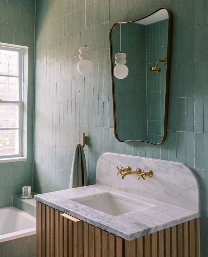 To recreate it, choose a tile with slight color variation so the wall looks hand touched. Pair with brushed brass taps and a mirror that has organic curves. That tiny pendant with stacked ceramic beads is a sweet detail worth copying. If marble isn’t in budget, use a quartz with a rounded upstand to hint at the same look.