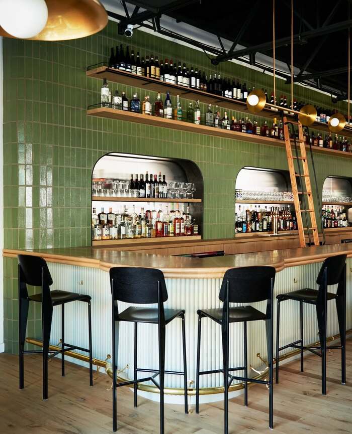 If you want a similar feeling at home, try a full height blue tiled wall around a bar nook or coffee area, then add a small wood shelf that repeats the arch shape above. Keep the grout medium so the grid doesn’t scream. I’d also add globe lights for soft pools of light.