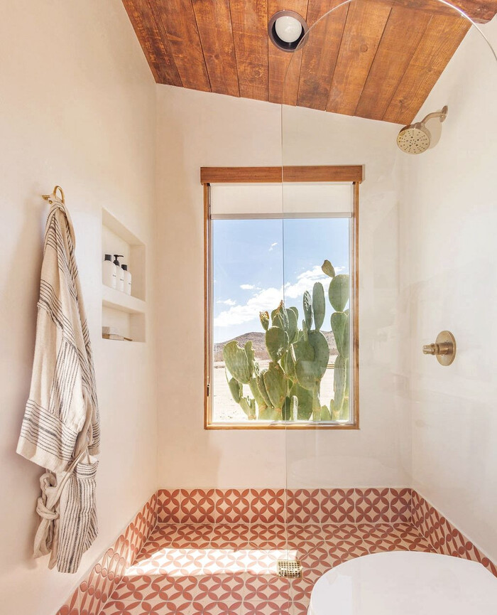 This sun drenched shower is my happy place. The patterned terracotta on the floor wraps up the walls a bit, creating a little tiled tub. It feels like a warm hug. The star of the show is the window framing a cactus view. Confession time, I once thought brown tiles make a room dark. Wrong. Here, creamy walls and a wood ceiling bounce light around so the cinnamon colored pattern glows. If you try this, keep wall tiles simple or even plaster, then let the patterned brown tiles be the drama.