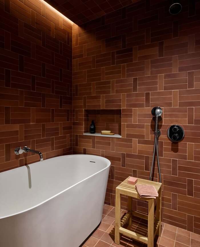 The last space is a mood. Walls are done in a herringbone pattern using long russet tiles, then tiny squares on the floor. A white tub breaks the brown and makes the pattern pop. The lighting is tucked up high so it washes the wall and shows off those zigzags. If you want texture without busy color, this is the plan.