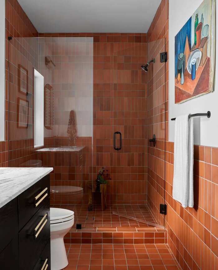 To get the look at home, run the tile floor up the step and inside the shower so it reads as one shape. Use a single niche, not two, so the pattern doesn’t get chopped up. I’d test two grout shades on a sample board, one that blends and one a shade darker. If your lights are cool white, swap to warm 2700K bulbs. Suddenly the terracotta looks like sunset. Variations: pumpkin brown tiles, brown subway tiles, reddish brown tile.