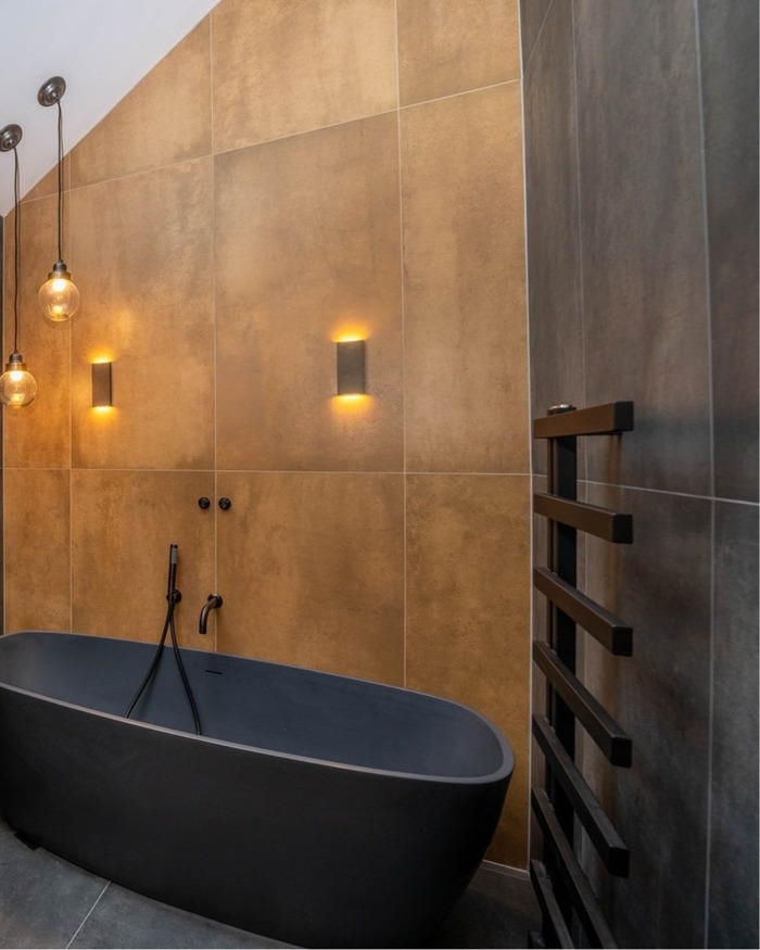 This bathroom feels like a boutique hotel. The big bronze gold tiles are about the size of baking sheets. Fewer grout lines make it calm and fancy. A matte black tub sits in front like a sculpture, and the tiny wall sconces throw warm pools of light. If you’re shy about pattern but love drama, go big format and smooth. It photographs so well.