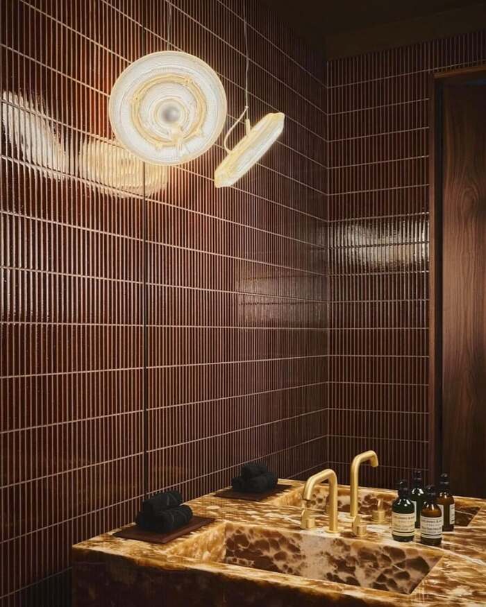 Oh my heart. Narrow glossy espresso tiles set vertically, almost like chocolate wafers, around a veined stone sink and a sweet brass faucet. The shine is everything. Light skims over the ribs and makes the wall move. If your bathroom is tiny, glossy vertical sticks stretch it. But be ready to wipe them, water marks show a bit.
