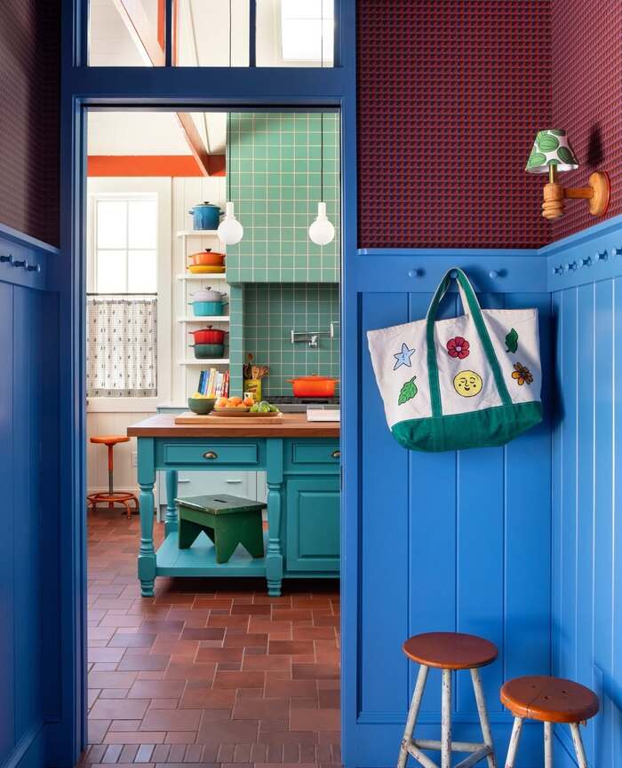 Here’s the surprise mashup I didn’t know I needed. A bright blue doorway frames a kitchen with green grid tiles on the backsplash and a brick red floor in a herringbone pattern. The contrast is playful and weirdly grown up. The floor is the glue. Red brown brick reads classic, then the colors on top can be brave.