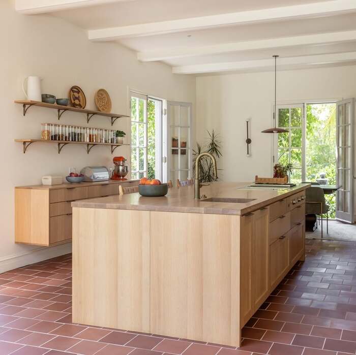 This kitchen feels like fresh bread. Pale oak cabinets float on the wall, then a soft terracotta floor warms the whole scene. It’s the simplest combo and maybe my favorite to live with. Brown tiles don’t have to be loud. When the texture is gentle and the color is like baked clay, the room stays calm.