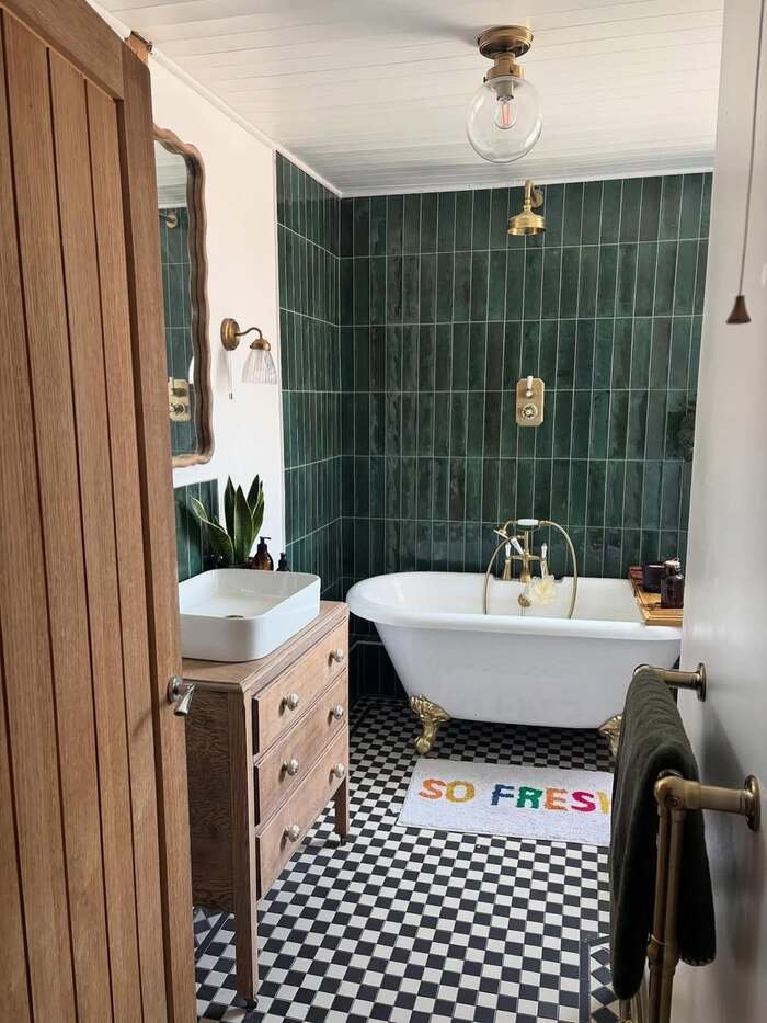 This space has personality. The floor is a tiny checker that reads like confetti from far away, then you step in and it’s neat and classic. Against the emerald vertical tiles the contrast is delicious. Brass fixtures and a cute “So Fresh” bath mat keep the mood playful, not stuffy. I love how the wood vanity warms the black and white.