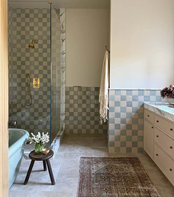 If you do want permanent checks, consider a small inlay at the shower threshold or a checker border along the wall. It’s a smart way to introduce a checker bathroom floor without turning the whole room into a pattern party.