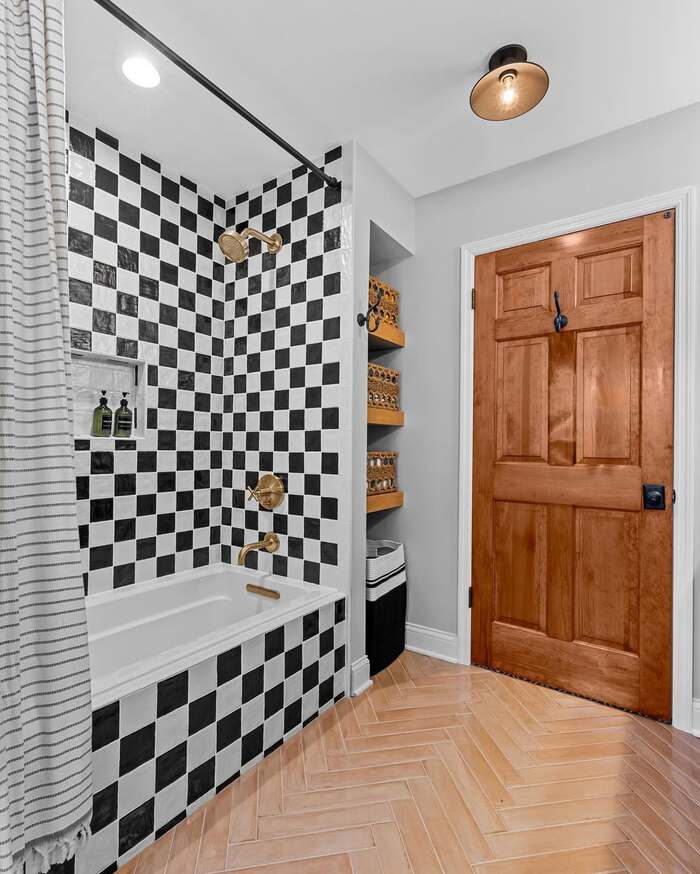 This bathroom flips the script. The checks move from the floor to the walls around the tub, which I didn’t think I’d like, and then I stared at it for three minutes and changed my mind. The glossy black and white squares climb up the surround and the shower wall like a classic game board. The peachy herringbone floor keeps it warm and modern.