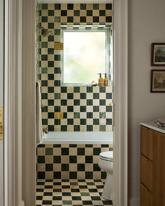 This room proves checkerboard can feel grown up. The same dark green and creamy marble squares run floor to ceiling around the tub and shower. Gold hardware sparkles against all that stone.