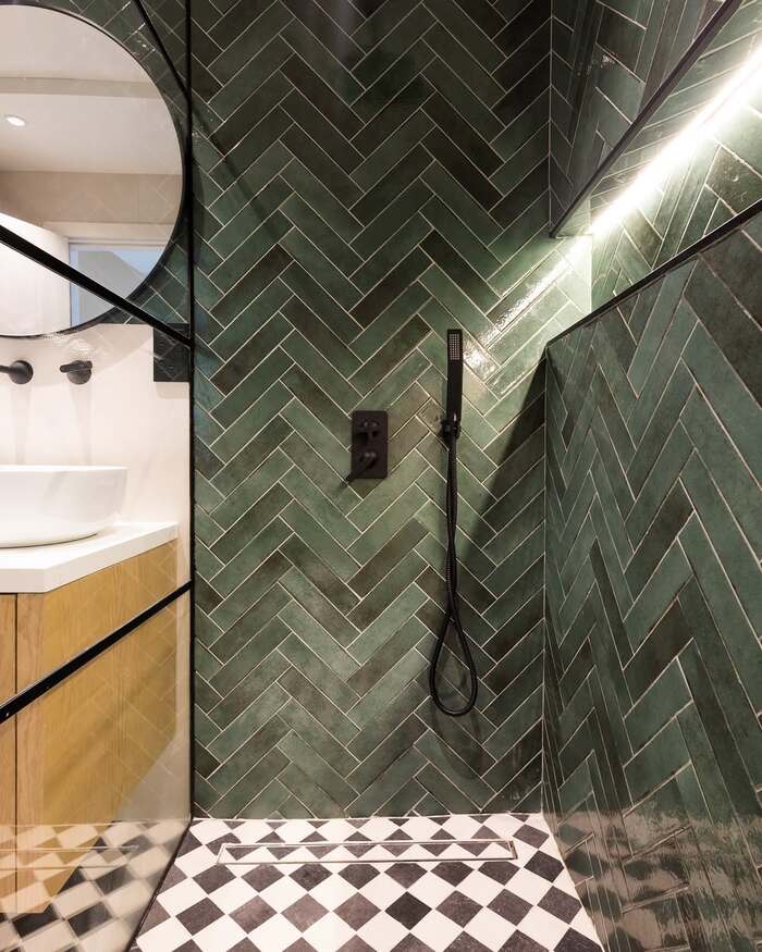 If you like movement, this shower sings. The floor uses diamonds set on point so it feels like a harlequin stage, and the walls go glossy green herringbone. The two patterns play well because one is angular and the other directional.