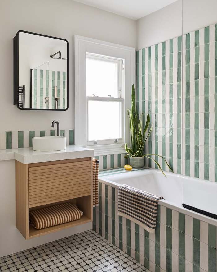 Fresh and happy. Vertical mint and white stripes wrap the tub and peek above the vanity backsplash, then the floor shifts to a tidy grid of small squares. It reads like a summer shirt. The floating vanity keeps the checks visible and the whole room airy.
