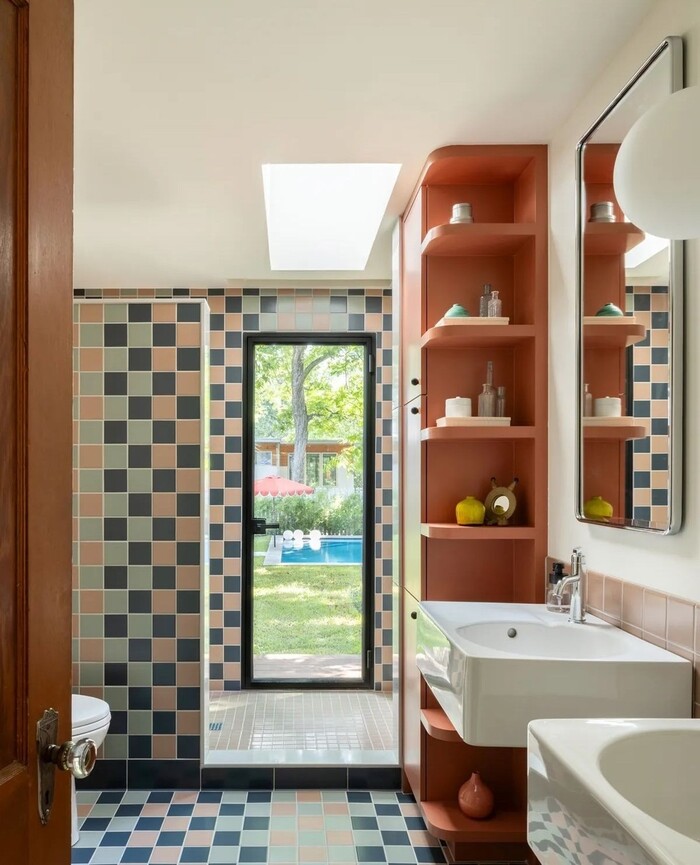 This one leans playful. Square tiles in teal, navy, peach, and cream wrap the room, then repeat at the pool door. Built in coral shelving ties to the warm tones in the floor. It feels like summer camp for grown ups.