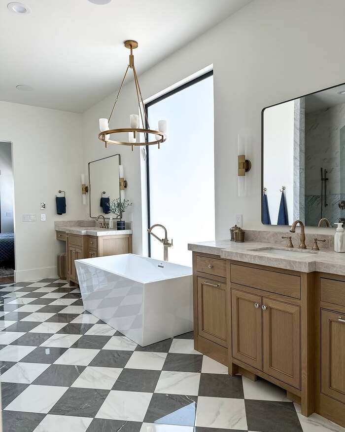 This space is calm and dramatic at once. Large gray and white squares set on the diagonal create a wide ribbon across the floor. Because the scale is big, the pattern feels like architecture, not just decoration. Warm wood vanities and brushed brass lighting make it cozy.