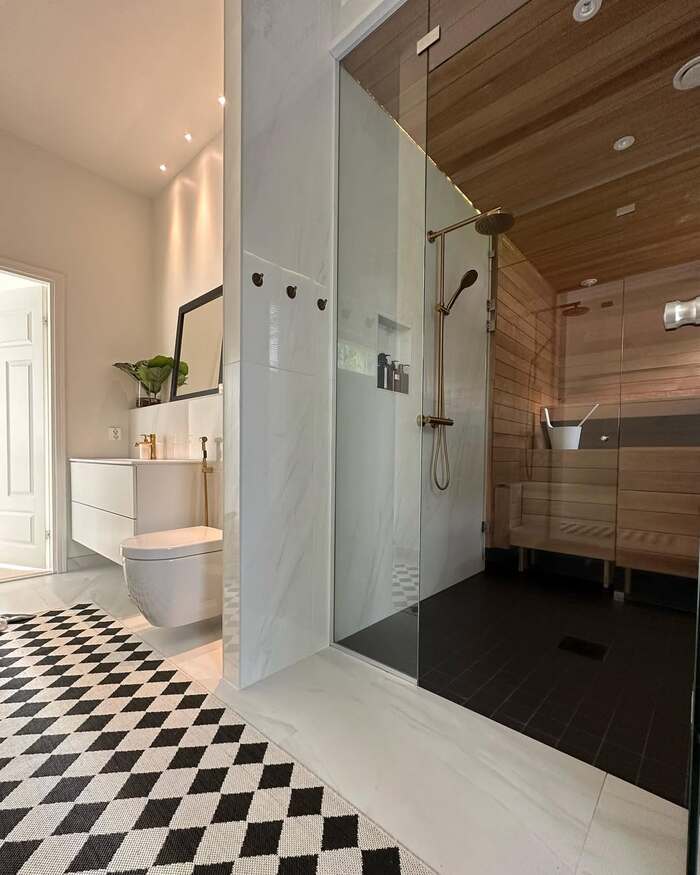 This bathroom sneaks in checks with a washable runner. The main floor is big format white tile, and the shower leads into a cedar sauna. The rug adds black and white diamonds that read like a checkerboard without permanent commitment. I love this for renters or commitment-phobes.