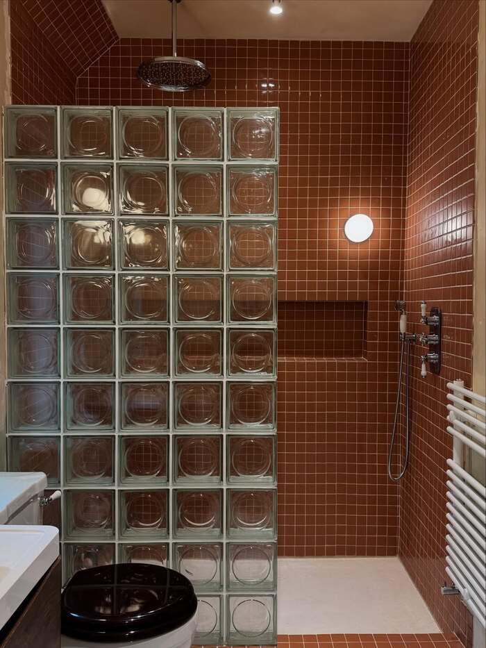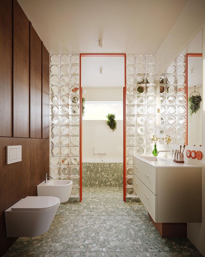 - Glass brick walls act like natural “light boxes,” enhancing brightness while remaining discreet.