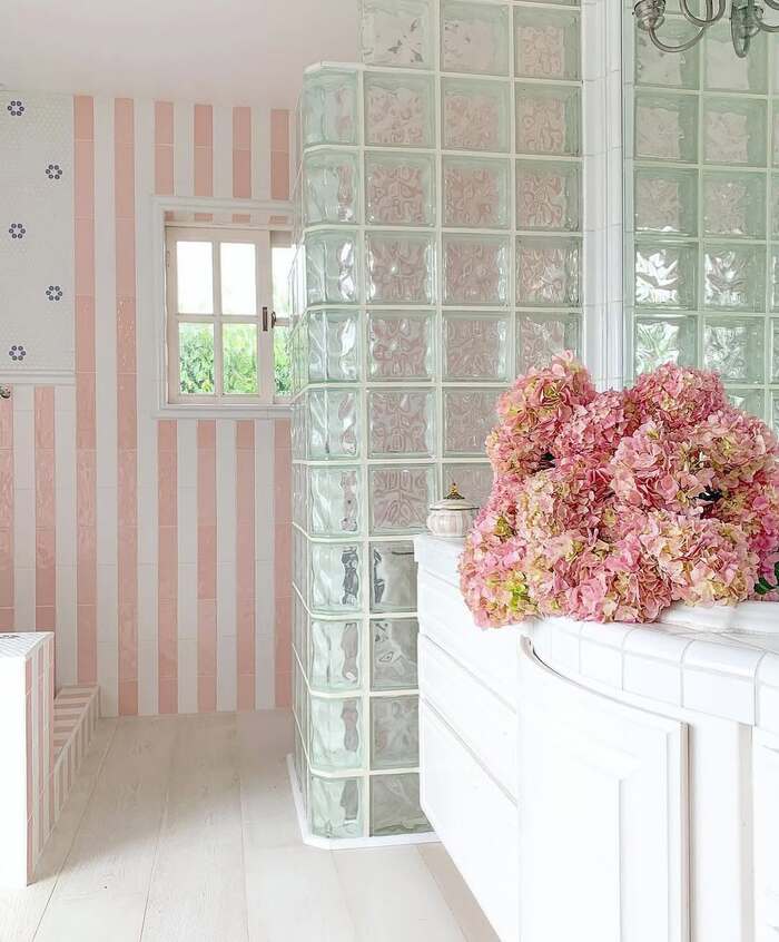 The second space is soft and feminine with pink and white striped walls, combined with frosted glass bricks in the bathroom that create a gentle partition. The stacked square glass bricks reflect light, highlighting the white sink and hydrangeas. SEO-friendly formula: frosted glass brick partition + pastel tones + light wood flooring makes the room spacious, bright, yet still discreet. This is a bathroom design idea with glass bricks for those who love a sweet retro vibe while remaining practical for everyday use.