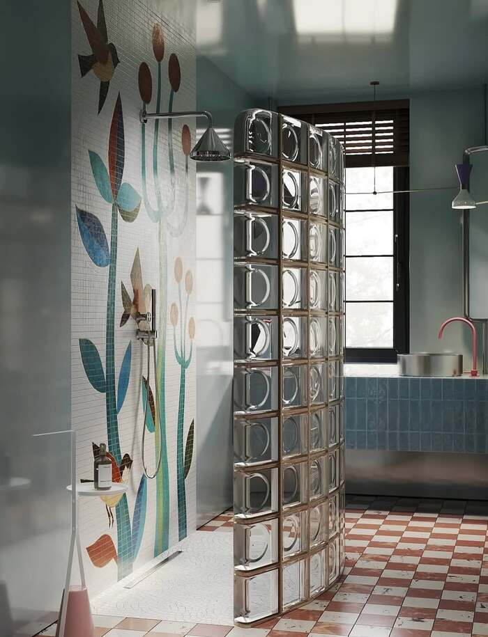 I didn’t expect to fall for amber, but that golden suite is pure honey. Tinted glass blocks wrap the vanity and soak the space in warm light. Pair with brass taps and you get cozy, not cheesy. If you love mid-century energy, do a band of amber inside a neutral glass block bathroom. Or try a blush wall next to minty glass mosaic tiles like the candy-striped bath. It’s brave but still soft. Another reason I keep returning to the 10+ glass tiles bathroom set for clients who want warmth.