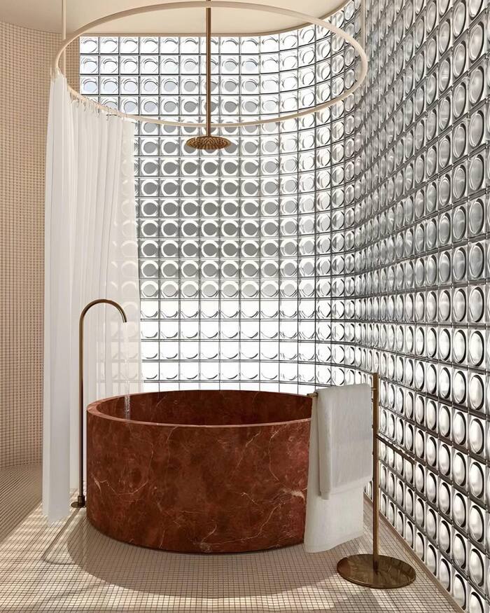 That round stone tub under a circular curtain rod is pure spa brain. The layered blocks behind it act like a cloud. Keep fixtures curved so the shapes agree with each other. A thin bench cut from stone sits nice against a clear glass block wall. Wipe it with a squeegee after showers. Fast habit, big payoff. This scene might be my favorite in the 10+ glass tiles bathroom group because it’s bold and gentle at the same time.