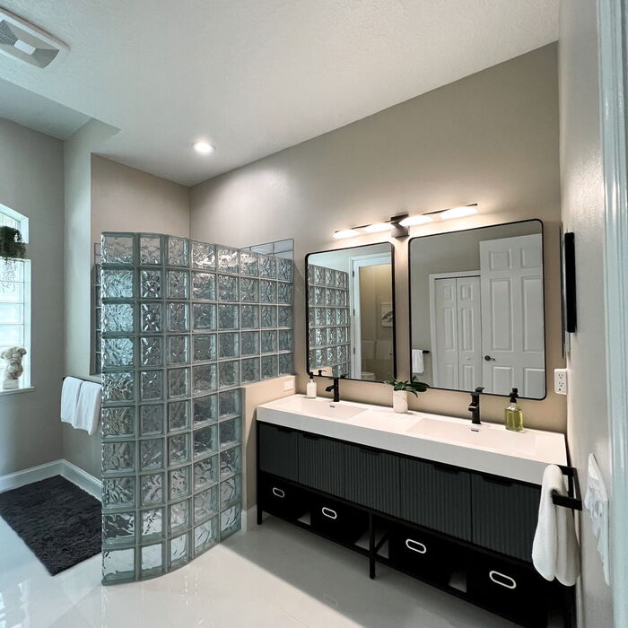 This model stands out with a curved glass tile shower wall that expands the visual space, retains water, and allows natural light in. The neutral beige-gray color palette, double vanity with black trim, and linear lighting create a sophisticated, tidy, and easy-to-clean feel. This is a great suggestion for minimalist bathroom glass tiles: use lightly patterned blocks to diffuse light, pair with matte black faucets, and include moisture-resistant glossy flooring. Suitable for townhouses and small bathrooms that desire privacy without feeling cramped.