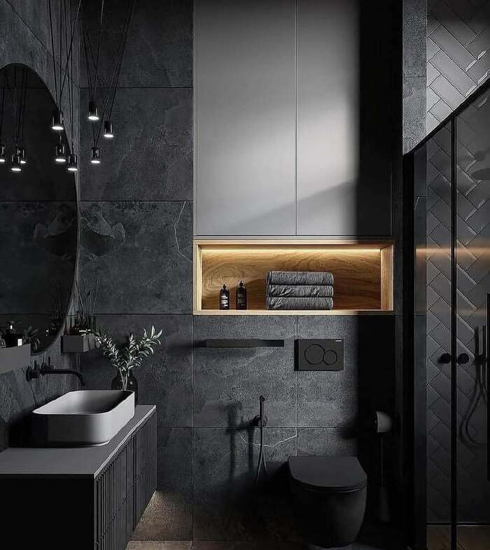 Deep graphite walls, a warm wood niche lit from within, and soft-glow pendants. I saved this one after my fourth coffee because it made me whisper wow. The lesson: even the darkest gray tiles in bathroom can feel inviting if you add warmth with wood and backlighting. Keep accessories minimal, though. Clutter kills the mood.