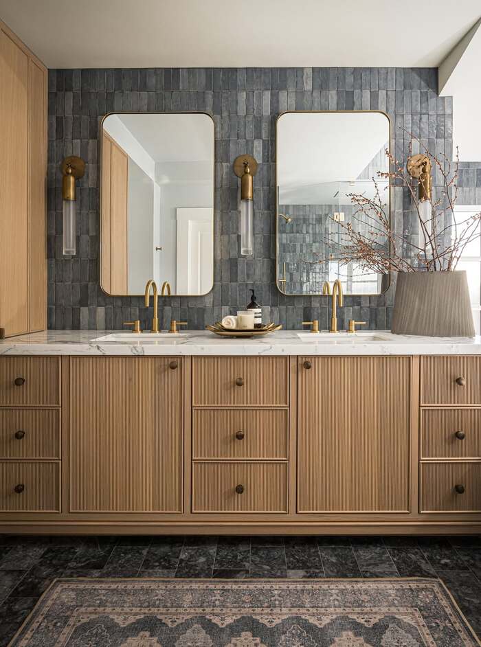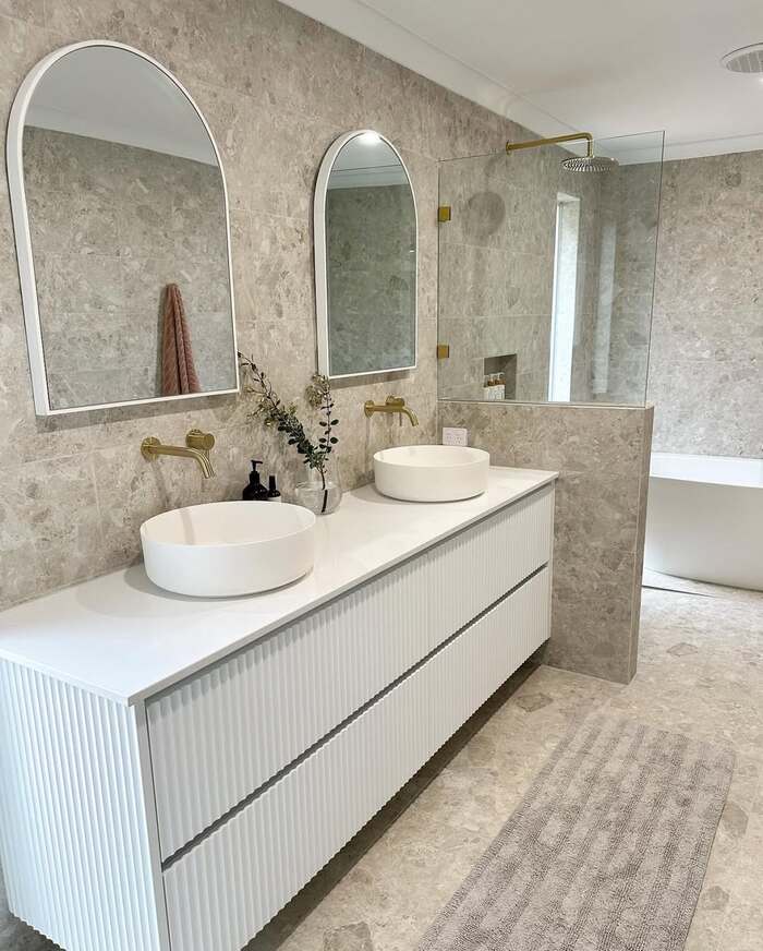 Floor to ceiling pale limestone. Double mirrors. Clean ribbed vanity. I love how the tone-on-tone grey bathroom tile reads peaceful, not boring. Keep grout close to tile color so your eye rests. And yes, add soft gold taps. If you prefer a bathroom with grey tiles that’s kid proof, pick porcelain over real stone. It stays pretty when life gets messy.