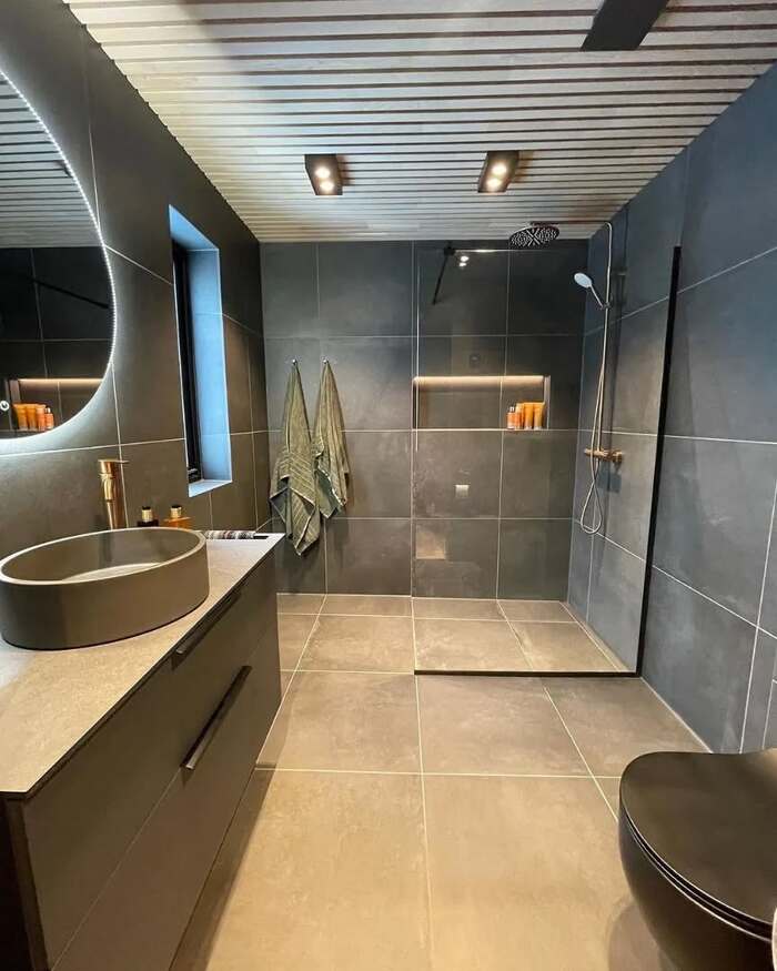 Large-format charcoal slabs with simple lines and a slatted ceiling. So moody, so dramatic, but still cozy. My confession: I used to think dark tiles made rooms smaller. True sometimes, but here the scale is big and the lighting is smart, so it feels rich. For a similar dark gray tile bathroom, add floor washers or LED strips in niches. Shadows do half the design work.